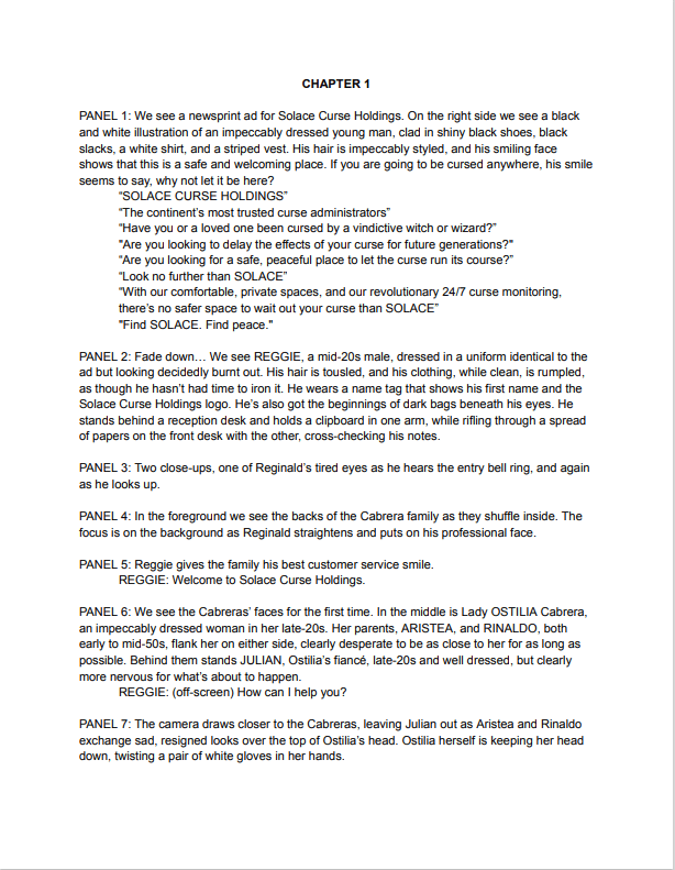 If you’re reading this, thanks for making it to the end of the post. As a treat, I offer you this: the first page of the script for Solace Curse Holdings! (At least, the current draft). I’m so excited about this project, and can’t wait for you to meet these lovely characters 😀